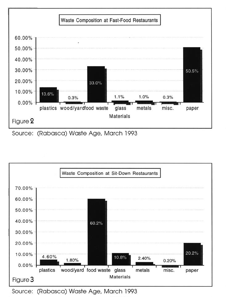 As shown in Figures 2 and 3, quick-service ("fast food") restaurants tend to have higher proportions of paper and plastics in their waste streams than sit-down restaurants. This is due to the packaging used to serve most food at quick-service establishments. Food items are typically packaged in plastic containers or paper. Beverages are often served in paper cups with plastic lids; napkins and silverware are usually disposable paper and plastics. At quick-service restaurants, there is minimal food waste because most patrons do not eat at the restaurant. The majority of the food served in quick-service establishments is already prepared and ready for cooking or serving, so there is also little or no waste from food preparation (Rabasca 1993).