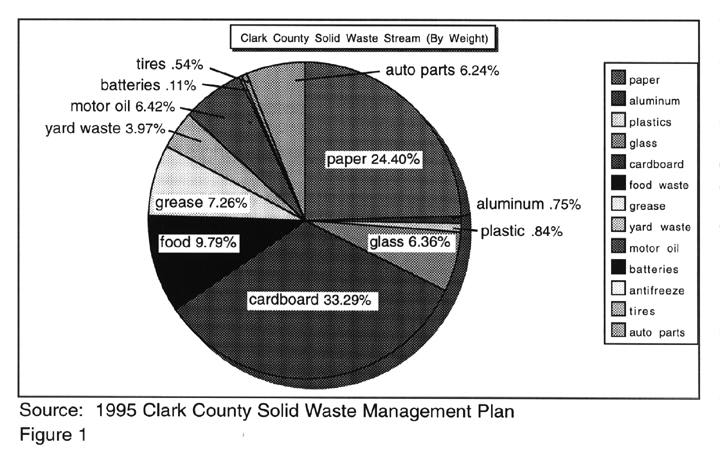 In 1996, 1,878,533 tons of municipal solid waste 2 and 1,502,650 tons of construction and demolition debris were generated in Clark County. The waste was disposed at local landfills (an additional 382,589 tons of materials were recovered for recycling). Harding Lawson Associates Engineering and Environmental Services, a Las Vegas consulting firm, estimates the local hospitality industry contributes 26.85% of the municipal waste stream generated in Clark County. This means more than half-a million tons of the solid waste disposed in 1996 was generated by Las Vegas hotels and restaurants. As shown in Figure 1, 33% of Clark County's solid waste was cardboard, 9.8% food waste, 7.3 % grease, 6.4% glass, and .75% aluminum (by weight), all of which are recyclable materials.