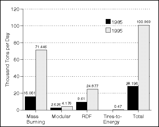 Source: Figure developed by the Energy Information Administration, based on data from Eileen B. Berenyi and Robert N. Gould, Resource Recovery Year (New York, NY: Government Advisory Associates, Inc., 1993), pp. 229-670, updated with