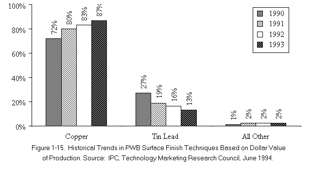 1-15 Historical Trends in PWB Surface Finish Techniques Based on Dollar Value of Production