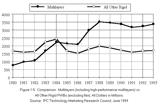 1-5 Comparison: Multilayers (including high-performance multilayers) vs. All Other Rigid PWBs (excluding flex)