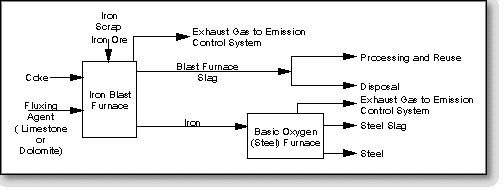 ORIGINIn the production of iron, iron ore, iron scrap, and fluxes (limestone and/or dolomite) are charged into a blast furnace along with coke for fuel. The coke is combusted to produce carbon monoxide, which reduces the iron ore to a molten iron product. This molten iron product can be cast into iron products, but is most often used as a feedstock for steel production.Blast furnace slag is a nonmetallic coproduct produced in the process. It consists primarily of silicates, aluminosilicates, and calcium-alumina-silicates. The molten slag, which absorbs much of the sulfur from the charge, comprises about 20 percent by mass of iron production. Figure 3-1 presents a general schematic, which depicts the blast furnace feedstocks and the production of blast furnace coproducts (iron and slag).