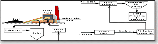 The most common type of coal-burning furnace in the electric utility industry is the dry, bottom pulverized coal boiler. When pulverized coal is burned in a dry, bottom boiler, about 80 percent of the unburned material or ash is entrained in the flue gas and is captured and recovered as fly ash. The remaining 20 percent of the ash is dry bottom ash, a dark gray, granular, porous, predominantly sand size minus 12.7mm (˝ in) material that is collected in a water-filled hopper at the bottom of the furnace.(1) When a sufficient amount of bottom ash drops into the hopper, it is removed by means of high-pressure water jets and conveyed by sluiceways either to a disposal pond or to a decant basin for dewatering, crushing, and stockpiling for disposal or use.(2) During 1996, the utility industry generated 14.5 million metric tons (16.1 million tons) of bottom ash.(3)