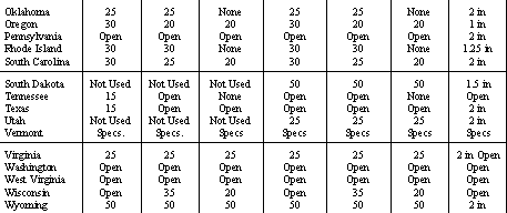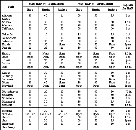 While all state highway agencies permit the use of RAP in base and binder courses, 10 agencies do not permit the use of RAP in surface courses. These include Alaska, Florida, Hawaii, Louisiana, Maine, Maryland, New York, Oklahoma, Rhode Island, and Tennessee. Louisiana and Maine allow up to 20 percent RAP in shoulder mixes only. Massachusetts does not permit the use of RAP in open-graded friction course mixes.(13) Minnesota permits RAP to be used in surface mixes only on low-volume roads.(5) Oklahoma allows up to 25 percent RAP for low- volume roads (fewer than 1,000 vehicles per day) only. Oregon does not permit RAP use in surface mixes on interstate highways.(13)