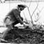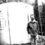 stands before a fiberglass tank which stores rainwater for garden irrigation at