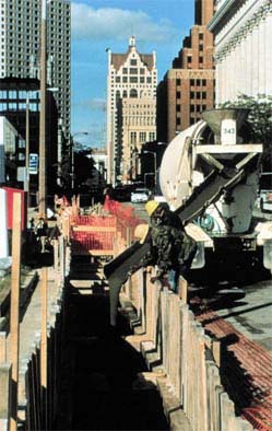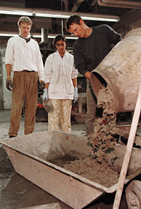 In much of his recent work with fly ash, Naik and the CBU have collaborated with Bruce Ramme, Wisconsin Electric Power Company's principal engineer and one of Naik's former students. "Dr. Naik is definitely an expert in the concrete field as well as the industrial by-products field," Ramme says. "It's very helpful for us to have students that graduate from UW-Milwaukee with the knowledge they have on coal-combustion products," he continues. "When they go out into the work force, they think of using these (recycled) materials as an alternative. . . . [T]hey know how to use them and the benefits of using them." The CBU, located in UWM's Engineering and Mathematical Sciences building, includes three laboratories: Cement Laboratory, Concrete Laboratory, and the Construction Materials Laboratory. Lab workers include graduate and undergraduate students as well as faculty and staff. In the various labs, samples are prepared and subjected to simulated weather conditions, immersion in chemically treated water, and—especially important in Wisconsin—salt exposure. Other concrete components Foundries are another large industry in Wisconsin—and another major source of by-products. In foundries, the molds into which metals are cast are made primarily of sand. Also, the iron that foundries collect and melt down contain impurities such as rust, which form a scum called slag on top of the molten iron. The CBU estimates that 900,000 tons of used foundry sand and slag are discarded every year in Wisconsin. The CBU has developed recipes for regular- and high-strength concrete using foundry sand, and adds slag to various types of concrete. Naik's foundry sand research has been sponsored by many Wisconsin foundries, the Wisconsin Department of Natural Resources, and other organizations. Using by-products from paper recycling may also improve the quality of concrete. When used paper is recycled, it goes through what Naik calls a paper "laundry." First the ink and coating are removed. Next to be removed is the filler, made of calcium carbonate or similar materials. What's left are wood fibers. Some of these wood fibers are too small or damaged to be recycled back into new paper. The non-recyclable wood fibers, filler, coating, and ink—about one third of the original paper—are collectively called de-inked solids, and Naik has found that its wood content would make it useful in concrete. He has worked with the Wisconsin Recycling Market Development Board, as well as forest-products company Weyerhaeuser, based in Tacoma, Washington, to use the sludge from de-inking facilities in concrete. Concrete is strong under compression load—when it's under pressure or supporting weight. But under tension load—when it's being pulled apart—wood is stronger than concrete.