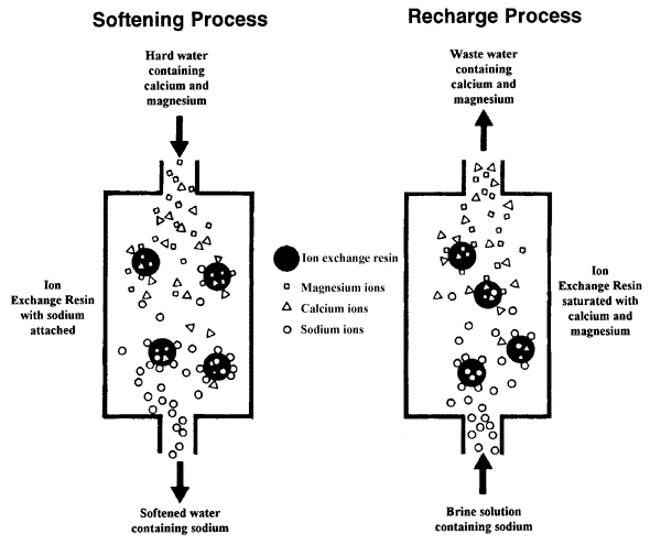 When the resin becomes saturated with calcium and magnesium, it must be recharged. The recharging is done by passing a salt (brine) solution through the resin. The sodium replaces the calcium and magnesium which are discharged in the waste water.