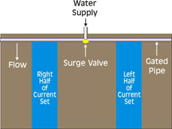 Surge irrigation is a technique that enhances furrow irrigation effectiveness by intermittently applying water to each side of a programmable surge valve. The placement of the valve depends on conditions specific to the sight and the goals of the irrigator. In turn, different valve configurations will require different management considerations. A typical valve placement and system description is shown in Figure 1.