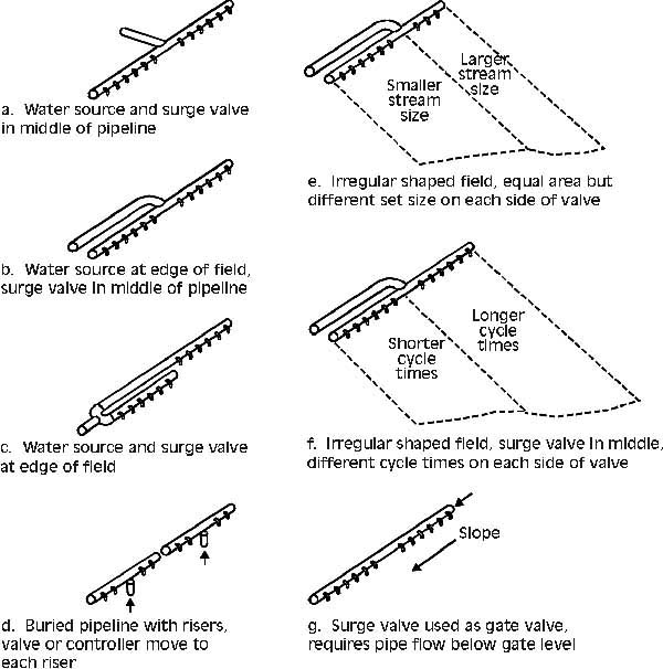 Field layouts for surge irrigation systems are shown in Figure 2(a-g). An ideal situation is to have the irrigation well or water supply located near the middle of the gated pipeline (a). The valve could then be placed so there is equal land area or number of furrows on each side of the valve. Many times this is not possible and the water supply must be brought to the appropriate location using mainline pipe (b). Another method is to place the surge valve at the edge of the field and use two parallel lines conveying water down the field cross-slope (c). This is the desired layout if lay-flat plastic pipe is used to achieve constant downhill water flow. For cases (a), (b) and (c), water is alternated between open gates on either side of the surge valve. This requires that gates are opened on each side of the surge valve every time a new irrigation set is made.