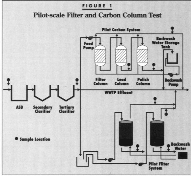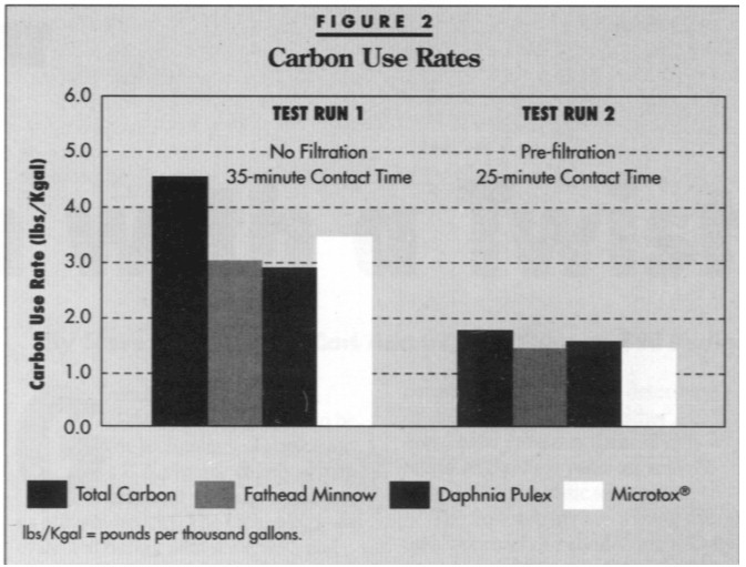 Pilot study. The pilot-scale GAC system consisted of two adsorbers arranged in a series. Each was 4 feet in diameter and 5.5 feet deep (Figure 1). The hydraulic loading rate was 2.4 gpm per square foot during the first test run and 3.2 gpm per square foot during the second test run. These rates corresponded to empty-be contact times of 35 minutes and 25 minutes, respectively. (Two times were used to define the impact of flow rate on the width of the toxicity mass transfer zone). During the test program, 24-hour effluent composites from the treatment plant and pilot system were collected, and the lead column and filter units were backwashed when their head loss reached 30 pounds per square inch. The innovative approach developed for this study involved using toxicity rather than such conventional parameters as total carbon or TOC as the "constituent of concern" for determining GAC breakthrough and saturation and the need for GAC changeout. Toxicity monitoring was performed using three species: fathead minnows, Daphnia pulex and Microtox¨ , a system developed by Microbics Corp. (Carlsbad, Calif.). The Microtox¨ test was used because it requires less than one hour to complete, while static toxicity tests take 48 hours. The test works by comparing the light output from bioluminescent bacteria in contact with the water to a control (reagent blank). Microtox¨ EC50 values - the concentration at which a 50 percent reduction in light emission occurs - were converted to TUs for cross-species comparison by dividing the EC50 into 100. An inherent assumption was that Microtox¨ values were equivalent to TU values. If Microtox¨ showed a reasonable correlation with fathead minnow and Daphnia pulex results, it would be a convenient, real-time technique for monitoring a full-scale GAC system for toxicity breakthrough and saturation. Column changeout during the pilot study was predicated on toxicity breakthrough and saturation for either fathead minnows or Daphnia pulex, whichever occurred first. At saturation, the lead carbon column was taken out of service, reloaded with fresh carbon an placed in the polish position. The former polish column then became the lead column. A test run was considered complete when the former polish column - now in the lead position - became saturated. Fathead minnow and Daphnia pulex tests were performed frequently to provide a rigorous measure of toxicity for comparison to Microtox¨ results. Conventional chemical parameters also were measured, although all decisions concerning the pilot study were based on toxicity. Results. Test conditions and results for both runs are presented in the table below. Average influent conditions were calculated for the entire duration of both runs, which each included one column changeout. The breakthrough values and saturation times are averages for the two lead columns for each test run. The saturation time in each test run was converted to a carbon use rate (pounds of carbon per thousand gallons of treated effluent).