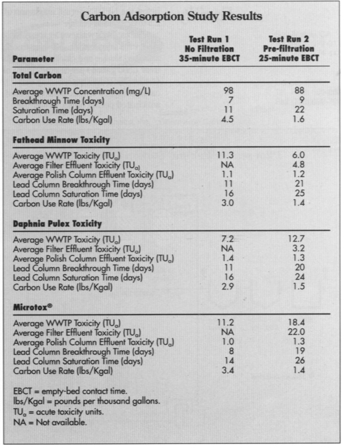 Sizing up. The use rate during the pilot-scale study was low for a wastewater treatment application. Results demonstrated that, even at the highest flows tested, the toxicity mass transfer zone was contained by one GAC vessel. This means GAC in the lead vessel could be used until complete saturation without compromising effluent quality. It also means a full-scale system would be fairly flexible in terms of timing GAC changeout or handling temporary increases in flow rate. The proposed full-scale system, including pre-filtration, is designed at a 30-minute empty-bed contact time. This design will accommodate planned increases in wastewater flow from 1,500 gpm to 2,000 gpm, with only a minor addition of equipment. The projected GAC cost associated with a full-scale system is 75 cents to $1.50 per thousand gallons treated. To alleviate potential problems associated with highly fluctuating TDS levels, the facility was advised to seek approval for a diffuser to enhance the dispersion of TDS in its effluent. Although Microtox¨ was not a useful parameter for predicting the exact toxicity values for Daphnia Pulex and fathead minnows, it was useful for estimating breakthrough times for the carbon columns. It quickly verified that no toxicity was escaping from an individual carbon column after changeout and startup. It also provided a conservative indication of when a GAC column required changeout. It was determined, therefore, that the Microtox¨ test could be used as simple, rapid method for monitoring a full-scale system at this facility.